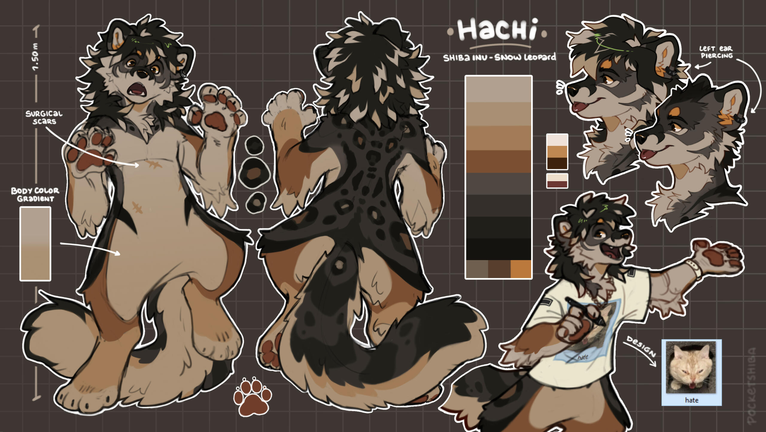 Hachi My Personal OC, a Shiba - Snow Leopard. Silly and tooo anxiety boy, usually panics internally and don't know what to do. Loves puppies and cats, cat memes specially. Hollow Knight his fav game, dies with almost all 3D videogames.